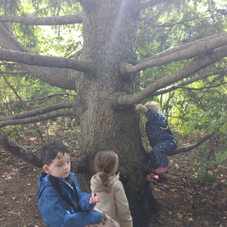After lunch, we ventured out on a foraging hike. We identified trees, tried our hands at climbing (they got sticky in the Spruce trees), and played at the big park on the climbers AND with our new walky talkies. On our return, we came back to closing circle and shared what we found along the way on our sharing board and our favourite parts of the day. We ended with outside play time after packing up all our gear for the day.