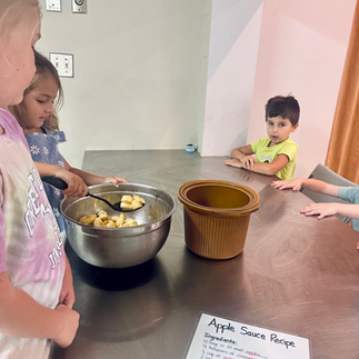 We were in the kitchen Tuesday moving through the next steps in our recipe. This process involved recall from the students as well as exploration of numbers and fraction basics. Teamwork and patience were also present or at least practiced. We completed step 5: ‘mash apples’ on Wednesday and got to eat it up! Everyone approved.